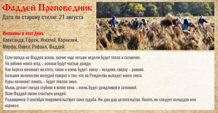 Дождь в этот день обещает сухую осень и хороший урожай на будущий год.