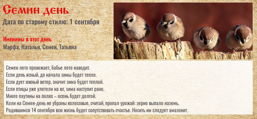 14 сентября – день начала бабьего лета. В народе он получил название Семин день. Именно в это торжество женщины начинали промывку льна. Примета гласила, что если пряди получались ровными, то девушка встретит богатого и достойного мужчину, если пряжа постоянно путалась, то муж буде отличаться плохим нравом.