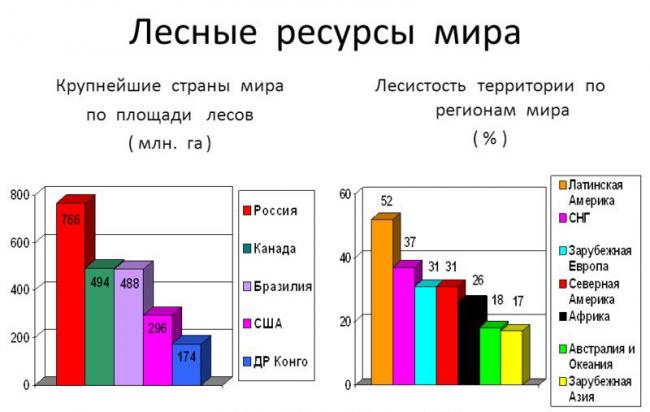 Лесные ресурсы земли — важный ресурс биосферы. Лесные ресурсы включают в себя такие богатства, как древесина, пробка, плоды, грибы, ягоды, лекарственные растения, орехи, охотничье-промысловые угодья. Кроме того, к лесным ресурсам стоит отнести такие их полезные свойства, как способность оздоравливать человека, сохранять водные запасы, регулировать климат, противостоять эрозии почв. Самая большая площадь лесных угодий (40 процентов) находится в Евразии. Эта площадь может поставить две третьих запаса ценных пород дерева. Менее всего лесных площадей расположено на территории Австралии. Совсем отсутствуют лесные массивы в Катаре, Бахрейне, Ливии. Больше всего лесных площадей находится в Южной Америке. Много лесов в России, Бразилии, Канаде, США.