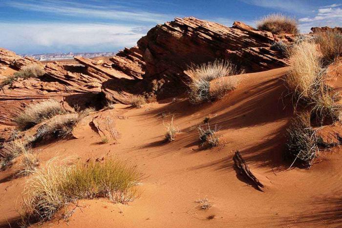 4. Умеренные пустыни и полупустыни. Их главная отличительная особенность - практически полное отсутствие растительности и скудный животный мир. Природных зон такого характера достаточно много, расположены они в основном в тропиках. Умеренные пустыни есть в Евразии, и им свойственны резкие перепады температур по временам года. Животные представлены главным образом рептилиями.