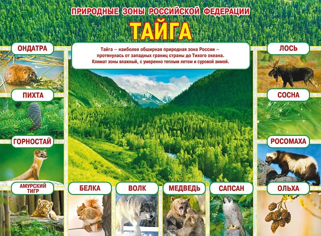 Тайга – самая большая природная зона России, южнее ее находится зона лесов, либо лесостепь. Зима здесь достаточно теплая 16-20 градусов мороза, летом 10 - 20 градусов тепла. Внутри зоны существуют значительны природные различия так, как она расположена в двух климатических поясах - субарктическом и умеренном. С юга на север зоны текут крупные реки Обь, Енисей и Лена.
