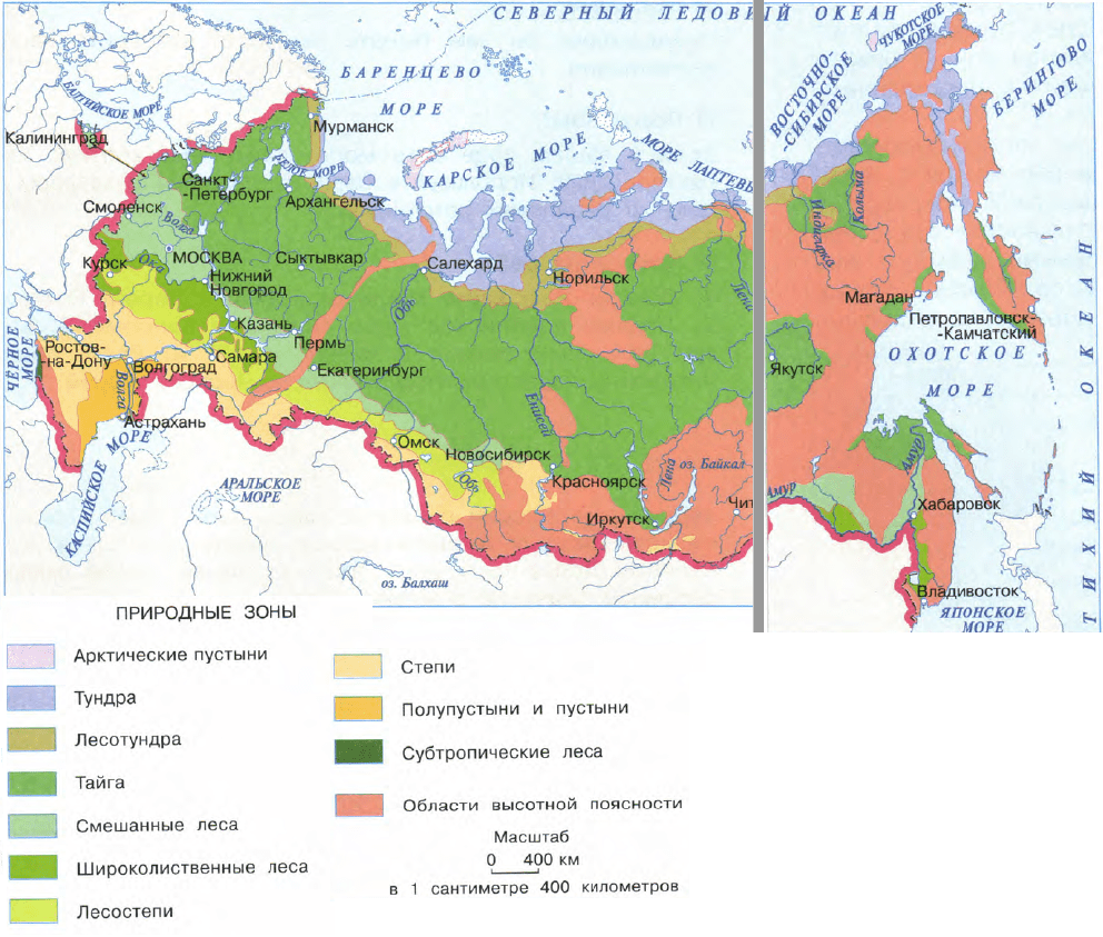 Имеются такие природные зоны: арктические пустыни, тундра, лесотундра, тайга, леса, лесостепи, степи, полупустыни, пустыни, субтропики.