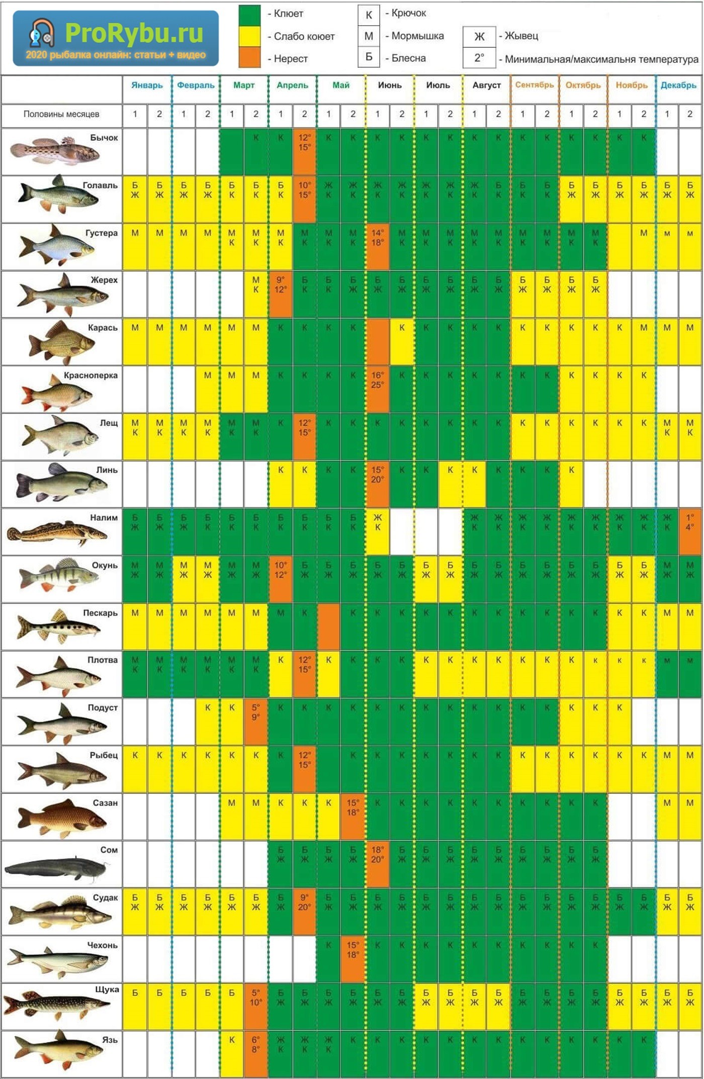 Здесь в таблице наглядно показано лучшее время для ловли рыбы (бычок, голавль, густера, жерех, карась, красноперка, лещ, линь, налим, окунь, пескарь, плотва, подуст, рыбец, сазан, сом, судак, чехонь, щука, язь) по месяцам.