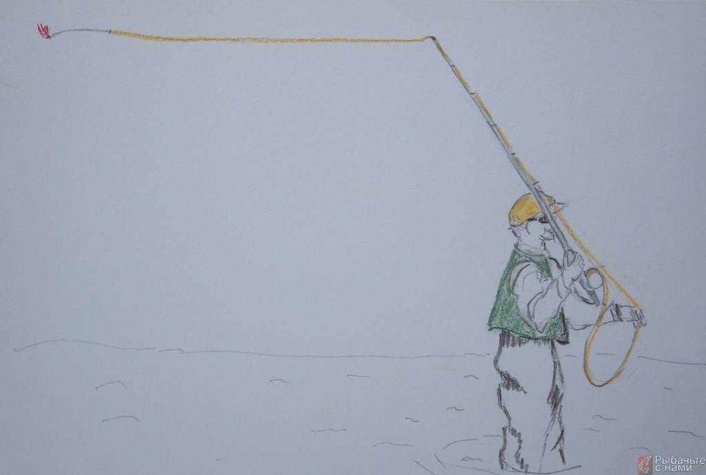 Рис. 2. Шнур должен полностью раскрыться. На рисунке показан момент начала заброса вперед: шнур при отбросе назад полностью раскрылся, и можно плавно начинать посыл шнура вперед с нарастающим ускорением.