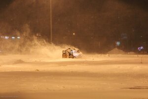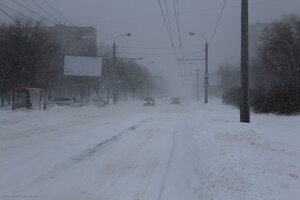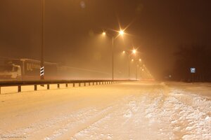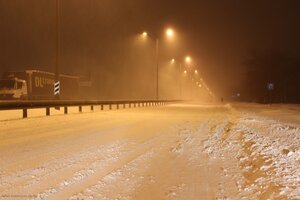 После 339-й началась сплошная каша. Машинку на шипах немного подбрасывает, но препятствия успешно преодолеваются. Перед мостом над жд путями - видимость метра 3. Сильная позёмка.
