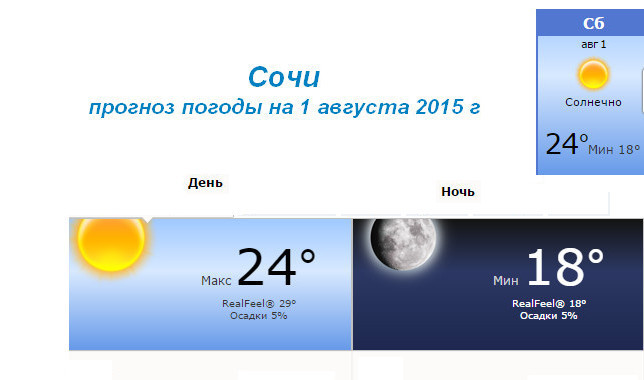 Пиктограммы фактической погоды (в самом вверху) обозначают преобладающую погоду в соответствующие сутки. Например, если в течение 14 часов, была пасмурная погода и дождь, затем в последующие 3-4 часа облака рассеялись и в оставшиеся часы суток была ясная погода, то будет отображена пиктограмма пасмурной погоды с осадками. Если разные состояния облачности распределились в сутках в равных долях, то предпочтение будет отдано дневной погоде.