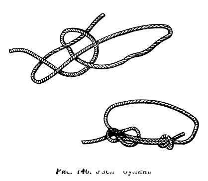Узел «проводника» (рис 139) и узел «булинь» (рис 140) применяются для обвязки при страховке во время движения в горах на середине веревки — узел «проводника», на конце веревки узел «булинь» узлом «проводника» можно также быстро соединить две веревки
