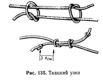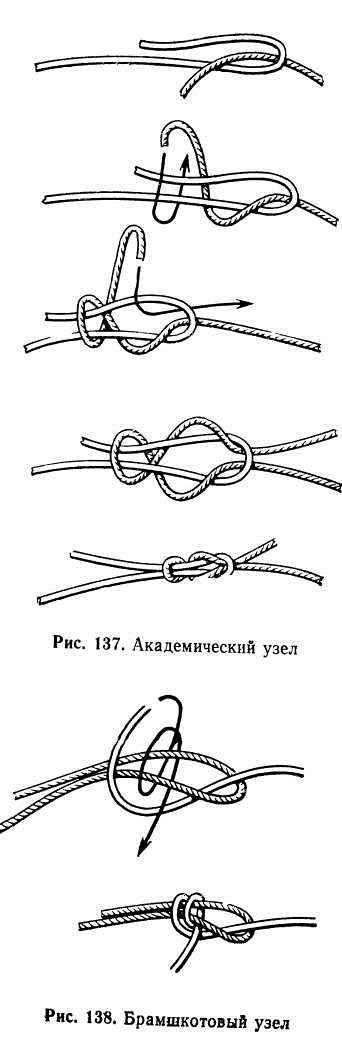 Две веревки одинакового диаметра надежно соединяются ткацким и прямым (морским) узлами (рис 135 и 136). Для связывания веревок разного диаметра применяются академический (рис. 137) и брам-шкотовый (рис 138) узлы.