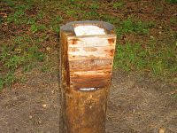 А вот Вам пример другого вида солонца. На мой взгляд, не самая лучшая конструкция. Одновременно могут лизать не более двух зверей (чаще один). Преимущество только одно - малый расход соли. Если давно нет дождя, то такой солонец "не работает" (не стекает рапа по стволу пня).