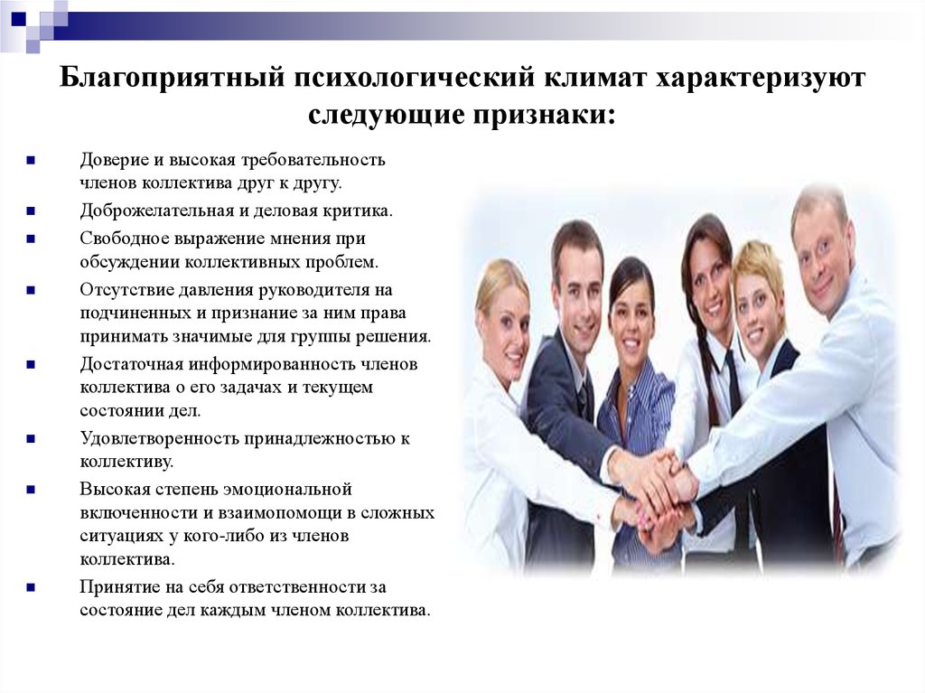 Благоприятный социально-психологический климат характеризуют оптимизм, радость общения, доверие, чувство защищенности, безопасности и комфорта, взаимная поддержка, теплота и внимание в отношениях, межличностные симпатии, открытость коммуникации, уверенность, бодрость, возможность свободно мыслить, творить, интеллектуально и профессионально расти, вносить вклад в развитие организации, совершать ошибки без страха наказания и т.д.