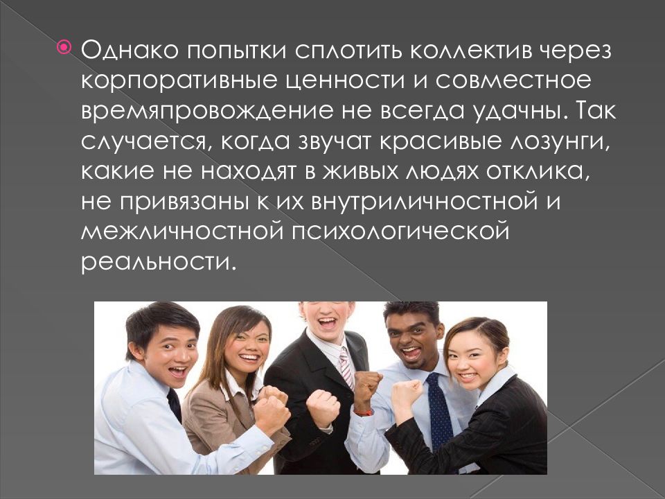 И второй показатель сплоченности коллектива — это равномерное распределение ответственности за результат совместной деятельности, а также личный вклад каждого члена коллектива в общий результат.