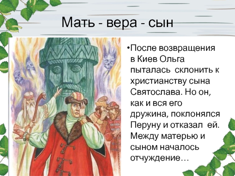 После возвращения в Киев Ольга пыталась склонить к христианству сына Святослава. Но он, как и вся его дружина, поклонялся Перуну и отказал ей. Между матерью и сыном началось отчуждение…