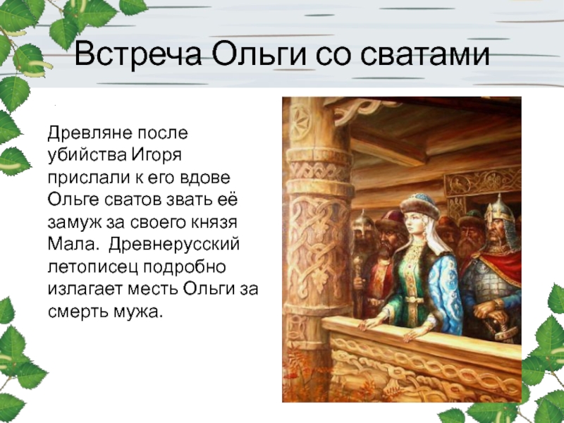 Древляне после убийства Игоря прислали к его вдове Ольге сватов звать её замуж за своего князя Мала. Древнерусский летописец подробно излагает месть Ольги за смерть мужа.