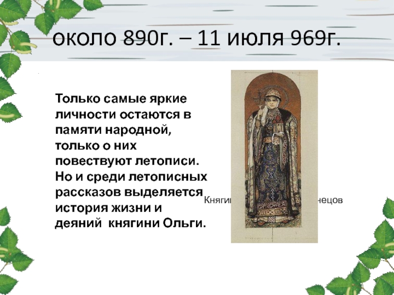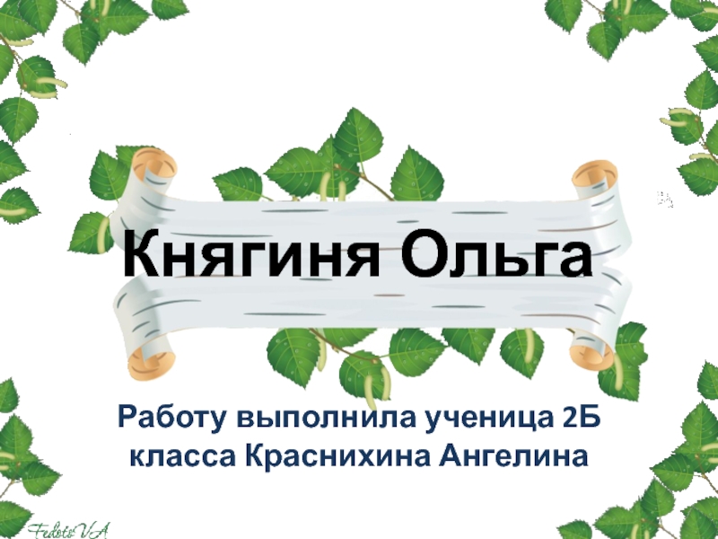 Презентация на тему Презентация на тему Княгиня Ольга, предмет презентации: История. Этот материал содержит 20 слайдов. Красочные слайды и илюстрации помогут Вам заинтересовать свою аудиторию. Для просмотра воспользуйтесь проигрывателем, если материал оказался полезным для Вас - поделитесь им с друзьями с помощью социальных кнопок и добавьте наш сайт презентаций ThePresentation.ru в закладки!