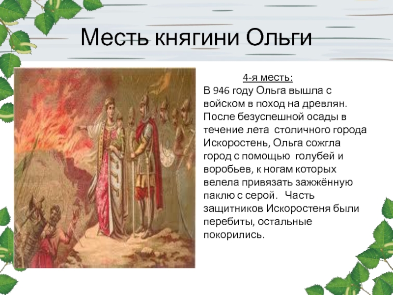 4-я месть: В 946 году Ольга вышла с войском в поход на древлян. После безуспешной осады в течение лета столичного города Искоростень, Ольга сожгла город с помощью голубей и воробьев, к ногам которых велела привязать зажжённую паклю с серой. Часть защитников Искоростеня были перебиты, остальные покорились.