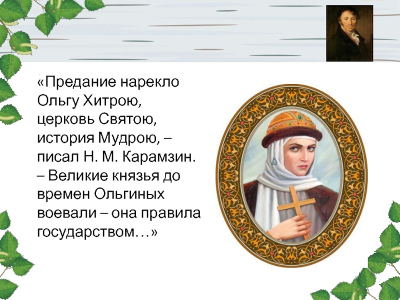 «Предание нарекло Ольгу Хитрою, церковь Святою, история Мудрою, – писал Н. М. Карамзин. – Великие князья до времен Ольгиных воевали – она правила государством…»