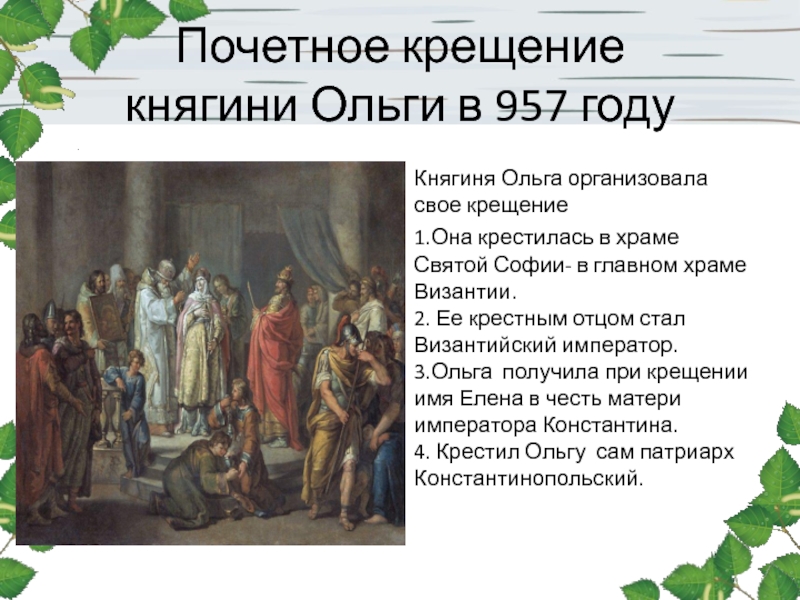 1.Она крестилась в храме Святой Софии- в главном храме Византии. 2. Ее крестным отцом стал Византийский император. 3.Ольга получила при крещении имя Елена в честь матери императора Константина. 4. Крестил Ольгу сам патриарх Константинопольский.