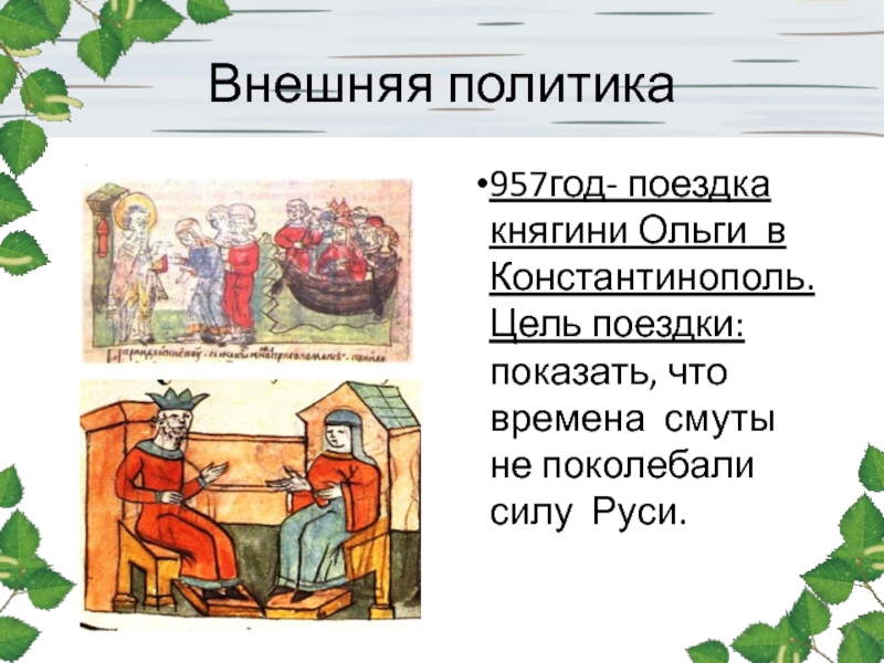 957год- поездка княгини Ольги в Константинополь. Цель поездки: показать, что времена смуты не поколебали силу Руси.