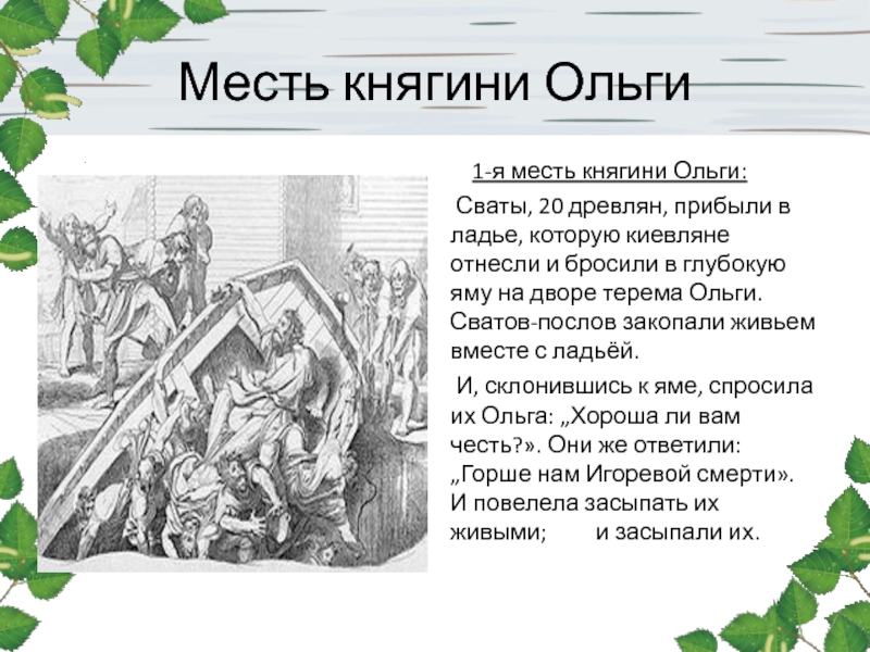 И, склонившись к яме, спросила их Ольга: „Хороша ли вам честь?». Они же ответили: „Горше нам Игоревой смерти». И повелела засыпать их живыми; и засыпали их.