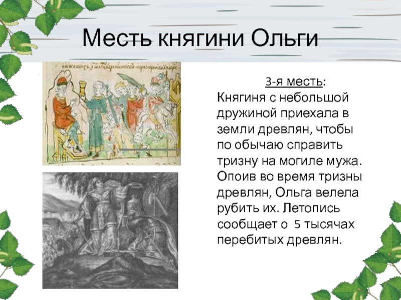 3-я месть: Княгиня с небольшой дружиной приехала в земли древлян, чтобы по обычаю справить тризну на могиле мужа. Опоив во время тризны древлян, Ольга велела рубить их. Летопись сообщает о 5 тысячах перебитых древлян.