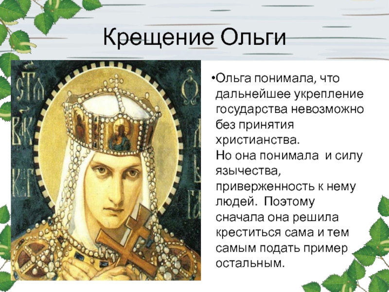 Ольга понимала, что дальнейшее укрепление государства невозможно без принятия христианства. Но она понимала и силу язычества, приверженность к нему людей. Поэтому сначала она решила креститься сама и тем самым подать пример остальным.