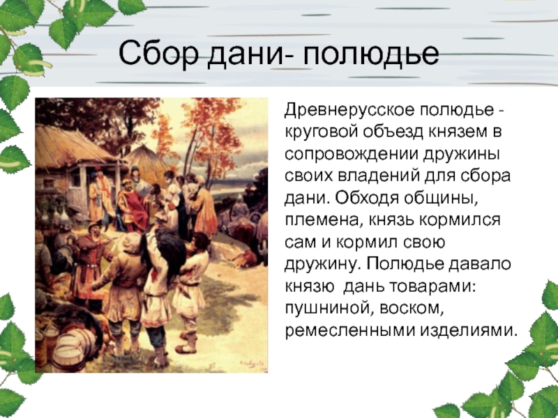 Древнерусское полюдье - круговой объезд князем в сопровождении дружины своих владений для сбора дани. Обходя общины, племена, князь кормился сам и кормил свою дружину. Полюдье давало князю дань товарами: пушниной, воском, ремесленными изделиями.