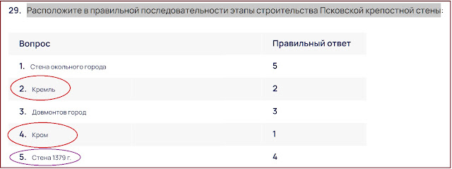 Кремль и Кром невозможно "расположить в правильной последовательности". Это одно и тоже. Но у авторов теста это два разных объекта. В летописях Псковский Кремль также именуется Кремом и Детинцем. Сегодня Кремлем (равно как и Кромом) часто называют два объекта - собственно Кремль и Довмонтов город .