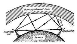 Рис. 1. 1 — земной луч; 2, 3 — лучи, отраженные от верхних ионизированных слоев атмосферы