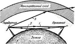 Самым важным свойством, определяющим радиоволны ультракоротковолнового диапазона, является их свойство распространяться на сравнительно небольшие расстояния. Считается, что принять приемником даже со специальной антенной радиоволны этого диапазона можно только на расстоянии прямой видимости. Практически при очень высоком подъеме приемной и передающей антенн над поверхностью земли это расстояние не превышает 80—100 км. Объясняется это тем, что ультракороткие волны не обладают способностью отражаться от верхних слоев атмосферы, как волны коротковолнового диапазона. При дальнем приеме коротких волн на антенну приемника действует не прямая волна, распространяющаяся от передатчика, а отраженная от верхнего слоя атмосферы земли. На рис. 1 показано, как происходит отражение коротких волн от такого слоя, находящегося в особом, так называемом ионизированном состоянии. Отражение от слоя может быть однократным (луч 2) и многократным (луч 3).