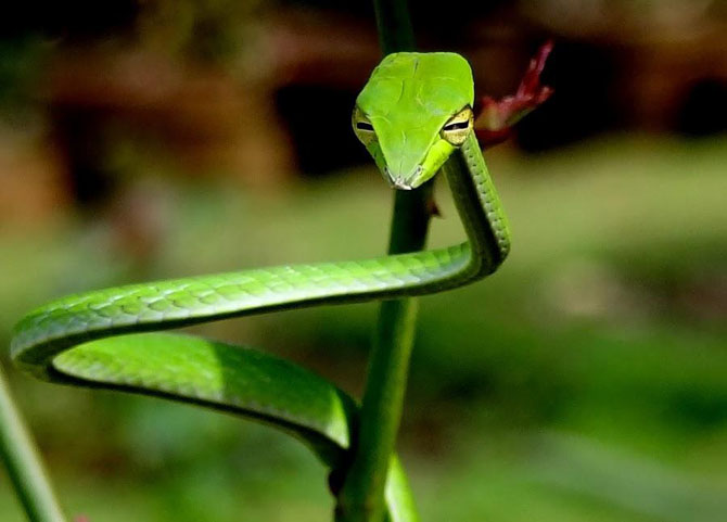 Всего около сантиметра в диаметре, винные змеи являются удивительно «стройным», вытянутым видом. Если змея залегла среди ветвей лесных деревьев, ее пропорции и зелено-коричневый окрас делают ее почти неотличимой от густых лианы и виноградных лоз. Голов змеи, такая же тонкая и продолговатая. Тихоходный хищник, активный в дневное и в ночное время, винная змея питается преимущественно молодыми птицами, которых он крадет из гнезд, и на ящериц. Если змее угрожает опасность, она надувает переднюю часть тела, открывая яркую окраску, которая, как правило, обычно спрятана, и широко раскрывает свой рот.