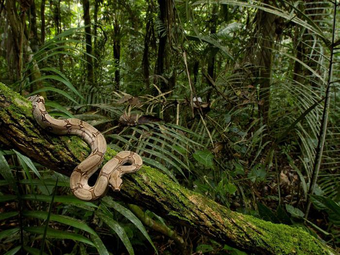 В наземном ярусе влажного тропического леса обитают крупные змеи, охотящиеся на грызунов, рептилий, амфибий, мелких копытных. В водоемах Амазонки живет самая крупная в мире змея - анаконда, достигающая длины 5 - 6м. Особенно разнообразны змеи древесных ярусов, окрашенные обычно в разные оттенки зеленого цвета и совершенно незаметные среди листвы. У древесных змей тонкое плетевидное тело, они искусно маскируются, замирая среди ветвей, становясь похожими на лианы или тонкие ветви.
