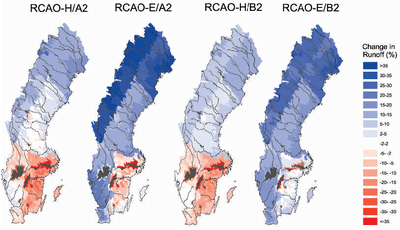 Рисунок 3. Изменение (в процентах) ежегодного среднего количества паводков для четырех климатических сценариев на период 2071-2100 годы по сравнению с 1961-1990 годами (рисунок. 5, Андреанссон и др. (2004)) (Нажмите для увеличения)