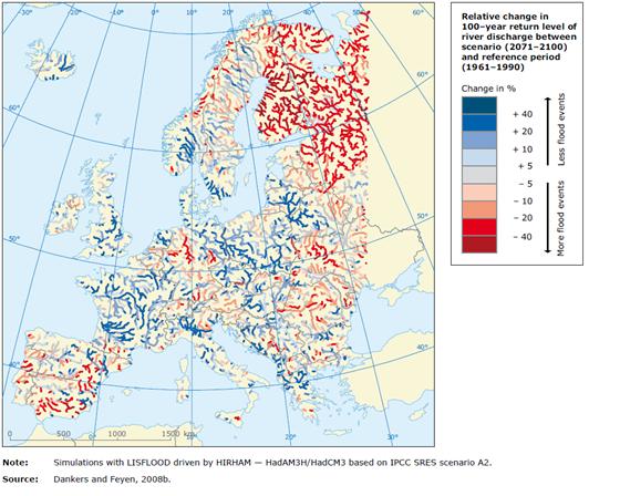 Рисунок 2. Расход воды в реках в 100-летней перспективе: изменение данных в 2071-2100 годах по отношению к базовому периоду 1961-1990 годам (карта 5.25, Европейского агентства по вопросам окружающей среды (2008)) (Нажмите для увеличения)