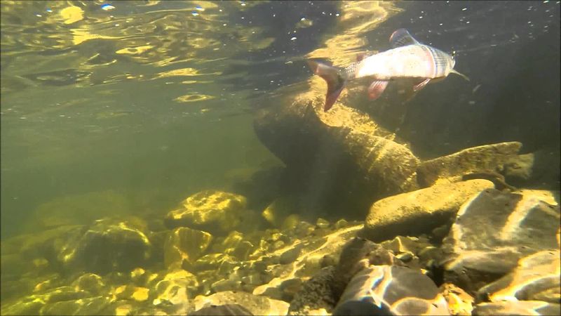 Стук приманки о дно относится к третьей группе - звукам среды обитания, однако рыба охотно идет на него, стремясь вплотную приблизиться к его источнику (можно предположить, что причиной подобного поведения рыб служит свойственное им любопытство). Вот что можно увидеть, наблюдая через лунку за хариусом.