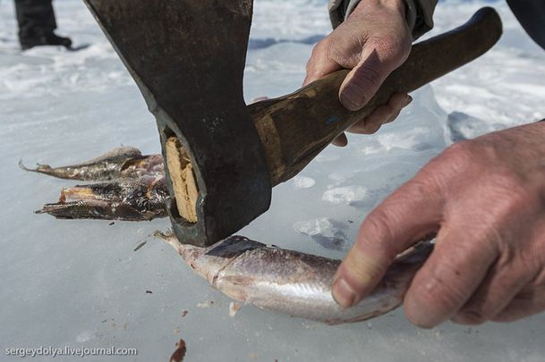 А вот бывалые рыбаки говорят, что для качественной проморозки достаточно 72 ч. Самые опытные из них практически безошибочно выбирают здоровую рыбу, только дав ей замерзнуть. Для расколотки предпочтительнее омуль. Тушку оборачивают полотняной тряпицей и несильно колотят обушком топора (топор всегда незаменим на рыбалке или охоте, к тому же широкий обух удобен при ударе и не рвет шкурку). После поколачивания рыбы шкурка легко снимается, а белое мясо само отделяется от костей. Тогда лакомые кусочки рыбы обмакивают в смесь соли с черным перцем, выпивают рюмку водки, отправляют расколотку в рот и заедают ржаным хлебом с луком.