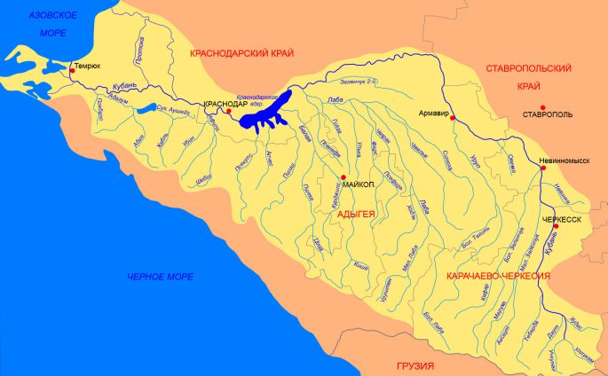 Главной речкой краснодарского края является Кубань, которая с левой стороны принимает многочисленные притоки. Часто ее именем называют весь край – Кубань. Численность населения края составляет 5200000 человек. Самой большой речкой Черноморского побережья является Мзымта. Для регулирования стоков речки Кубань были сооружены такие водохранилища, как Краснодарское, Тшикское и Шапсугское. На территории Краснодарского края располагается большое количество карстовых мелких озер, на побережье азовского моря, а также на полуострове Тамань имеются многочисленные озера-лиманы. Самым большим озером Краснодарского края и всего Северного Кавказа является Абрау. Кроме того, на территории края находится самый крупный во всей Европе Азово-Кубанский бассейн подземных пресных вод, который обладает значительными запасами минеральных и термальных вод.