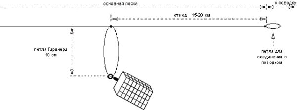 Чтобы связать ассиметричную петлю, нужно взять отрезок лески, длиной около 2-х метров и сложить его пополам. Отмерив от конца 40-50 см, формируется петля для крепления поводка. После этого, берутся свободные концы и складываются вместе, но так, чтобы один конец был длиннее другого на 20 см, после чего вяжется двойной узел. Ассиметричная петля готова. Чтобы облегчить крепление кормушки, на более длинный конец, перед завязыванием узла, одевается вертлюжок с карабином. Все не нужные концы лески обрезаются.
