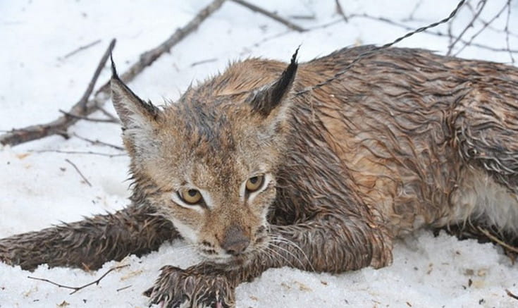 На фото измученная рысь в браконьерской петле.