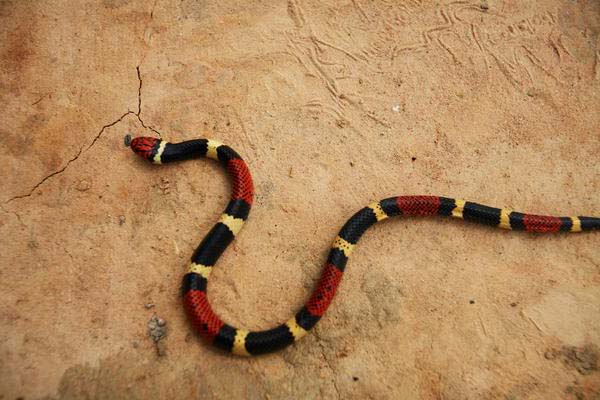 Окраску этой рептилии не спутать с другими представителями змей – их кожа покрыта кольцами черного, красного и ярко-желтого (кораллового) цвета.