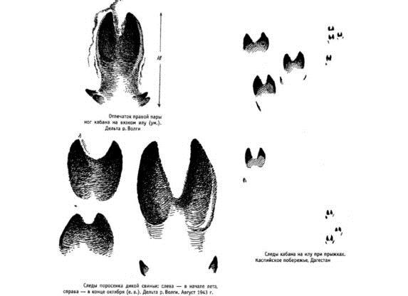 Чрезвычайно сходен со следом домашней свиньи, только относительно больше и резче его. Очертаниями своими он так- же (особенно старого кабана) напоминает след благородного оленя, с тою разницею, что задние придаточные пальцы на кабаньем следу расходятся в форме тетеревиных косиц шире всего следа, отпечатываются вместе с копытами без промежутков и что расстояние между следами короче. След кабана (самца) от следа свиньи (самки) отличается тем, что у кабана придаточные пальцы бывают больше, а копыта тупее и одинакие на всякой ноге, тогда как у свиней копыта значительно разнятся величиною одно от другого. И кроме того, тем, что кабан дает след более разлатый, чем свинья, ибо он на ходу заносит ноги больше в сторону. По размеру же и глубине отпечатка следа можно с достоверностью судить и о возрасте зверя.