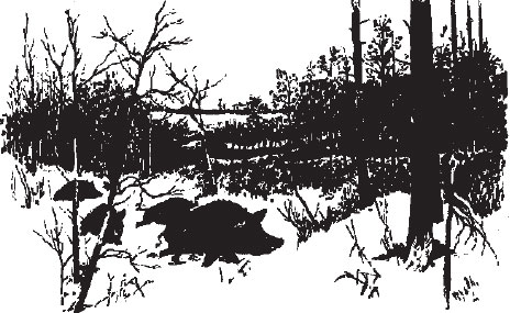 При обходе кабанов следует быть еще более осторожным, чем при обходе лося. Круг необходимо делать еще больше, ибо кабаны чутки и в высшей степени осторожны. Они не любят долгое время оставаться на одном месте, разве только глубокие снега задерживают их, но такие снега бывают очень редко. Обход следует тщательно проверять и торопиться с устройством облавы. Расстановку цепей лучше делать одновременно; цепь загонщиков ставится по возможности чаще и отодвигается шагов на шестьсот за линию обхода. Двигаться она должна средним шагом, и чем больше шума производит она, тем лучше. Хорошо велеть сделать несколько выстрелов в цепи и иметь там людей с ружьями. Фланговых цепей не ставят, они были бы бесполезны: раз почуяв опасность, кабаны прорвутся, цепь их не задержит. При выборе направления гона следует руководиться правилом, изложенным в облаве на лосей. Хорошо поставить на флангах мужиков с ружьями или же ставить цепь охотников полукругом. Обыкновенно кабаны идут прямо от кричан, но старые одинцы зачастую бросаются в сторону. Абсолютная тишина и спокойствие, конечно, необходимы и при этой охоте. Безопаснее для охотников становиться около пней или за деревьями. На обязанности распорядителя лежит объяснить неопытным охотникам необходимые правила для безопасности. Никогда не следует стрелять кабана, ежели он выбегает прямо на охотника (т. е. на штык). Нужно стараться, отскочив в сторону, пропустить его; во-1, кабан, особенно взрослый самец, часто бросается прямо на дым; во-2, имеет часто всю спину в смоле и весьма крепкий череп, по форме своей способствующий пройти пуле вскользь, <от чего> вероятия удачного выстрела уменьшаются. Гораздо удобнее стрелять его, когда он повернется боком; лучший выстрел — под ухо и под лопатку. Последнее место, не имея почти совсем шерсти, служит удобною целью. Это два единственных выстрела, от которых кабан остается на месте, с остальными же ранами он далеко уходит. Вообще кабан очень крепок на пулю. Поросят (вархляков) можно стрелять крупной картечью, но всегда следует иметь один ствол, заряженный пулей. К раненому кабану подходить следует весьма осторожно и сзади; для верности лучше всадить ему лишнюю пулю в ухо.