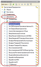 В Конфигураторе все объекты 1С находятся в окне конфигурации, разделенным по веткам. Документы 1С находятся в одноименной ветке. Раскрыв ветку Вы видите список конкретных документов. Методика работы была описана в предыдущих уроках. Редактор открывается двойным щелчком мыши по конкретному документу.
