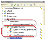 Усложнение 2. Бывает, что у разных документов должна идти сплошная уникальная нумерация подряд. Для этих случаев есть объект 1С – Нумератор. Он расположен внутри ветки конфигурации Документы, в самом верху.