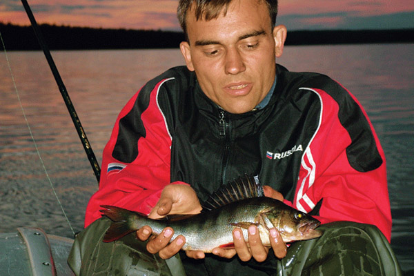 Вот раздался сначала робкий, затем все более звонкий голос колокольчика. Снасть чутко уловила поклевку. Леска слегка дрогнула и через миг провисла. Вдруг кто-то нахально рванул леску, да так, что сорвал со стойки удилище. Подсекаю и с удовольствием вывожу настырного, хорошо упитанного «полосатика». Вновь отправляю снасть к перепаду глубин, снова резкая потяжка, и крупный окунь бьется на крючке. Наиболее энергичные поклевки происходят на двухметровой глубине, где отмель плавно убегает в суводь. Однако клев кончается так же неожиданно, как и начался. Видимо, стая, интенсивно перемещаясь, ушла в другие слои воды.