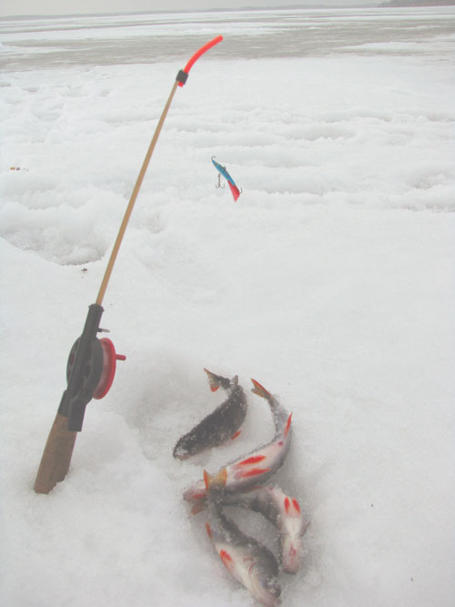 Надо проверить, тем более рабочий день заканчивался в шестнадцать часов - как раз успеваю добраться до дома, переодеться, взять снасти и в шесть вечера быть на льду. Совсем неожиданно на льду встретился тот самый блеснильщик, который здесь поймал судаков. Поздоровались. Узнал, каким "ветром" в рабочий день его занесло на лед. Оказывается, работа у рыбака такая: три дня вкалывает, три дня рыбу ловит. Рыболов мне посоветовал, чтобы зря времени не терять, насверлить по соседству с его лунками штук пять своих, что я и сделал.