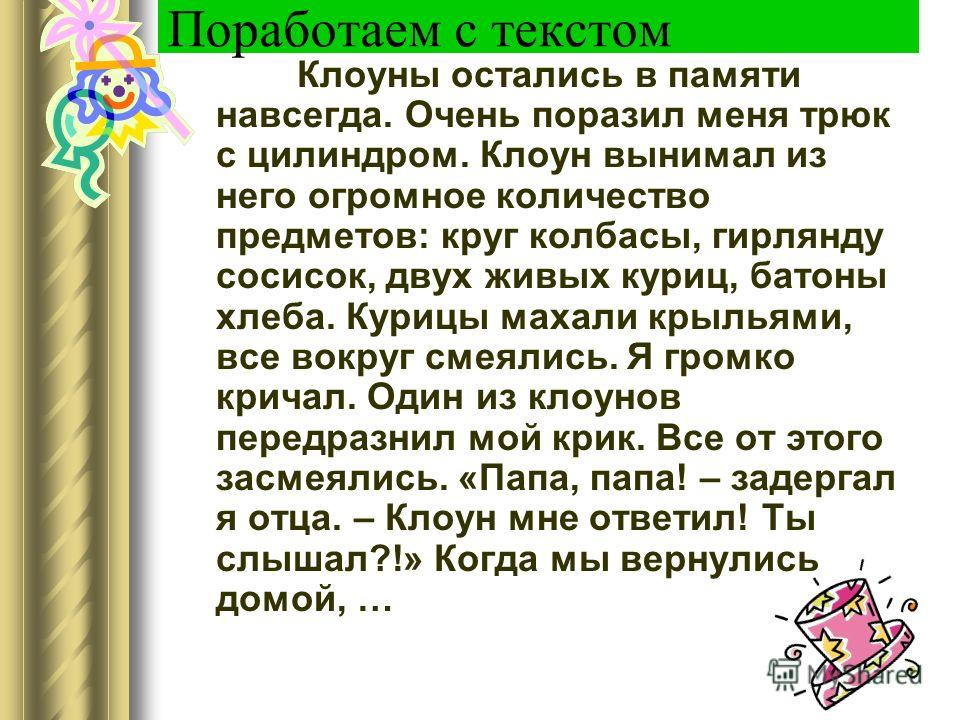 Поработаем с текстом Клоуны остались в памяти навсегда. Очень поразил меня трюк с цилиндром. Клоун вынимал из него огромное количество предметов: круг колбасы, гирлянду сосисок, двух живых куриц, батоны хлеба. Курицы махали крыльями, все вокруг смеялись. Я громко кричал. Один из клоунов передразнил мой крик. Все от этого засмеялись. «Папа, папа! – задергал я отца. – Клоун мне ответил! Ты слышал?!» Когда мы вернулись домой, …