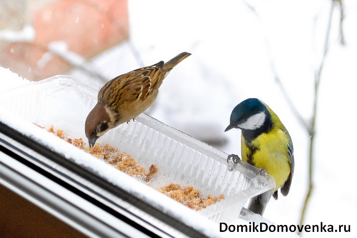 В холодный период года синицы регулярно наведываются в кормушки. Так как зимой птицы расходуют много сил на поддержание температуры тела, полезнее всего предлагать им максимально калорийную пищу - семена подсолнечника и тыквы, сало, сливочное масло, творог и сливки. Семечки и сало ни в коем случае не должны быть солеными, все нужно давать в сыром виде.
