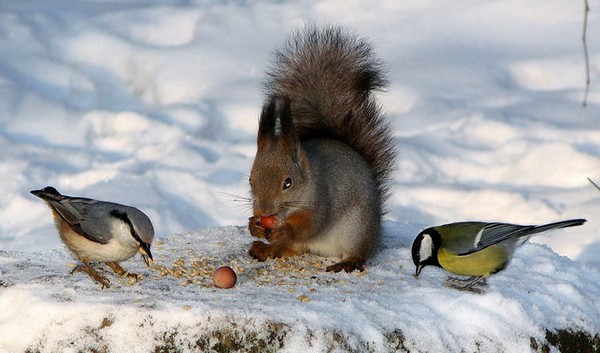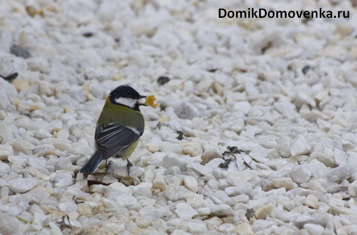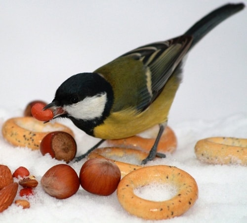 Не откажутся синички от мешанки из тертой моркови и вареного яйца, орехов, крупяных каш (готовить без соли). Невареную крупу зимой они едят неохотно, потому что для переваривания твердой пищи требуется больше энергозатрат.