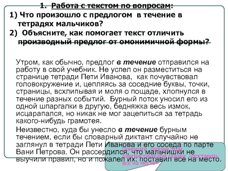 Утром, как обычно, предлог в течение отправился на работу в свой учебник. Не успел он разместиться на странице тетради Пети Иванова, как почувствовал головокружение и, цепляясь за соседние буквы, точки, страницы, всхлипывая и моля о пощаде, хлопнулся в течение разных событий. Бурный поток уносил его из одной шпаргалки в другую, бедняжка весь измок, исцарапался, но никак не мог зацепиться за тетрадь какого-нибудь грамотея.