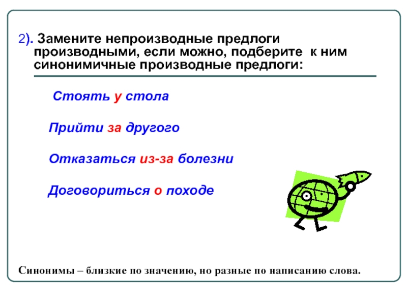 2). Замените непроизводные предлоги производными, если можно, подберите к ним синонимичные производные предлоги: